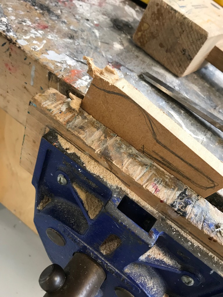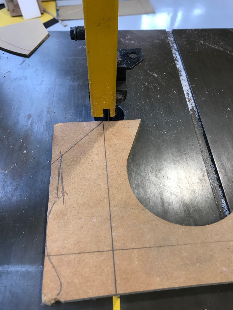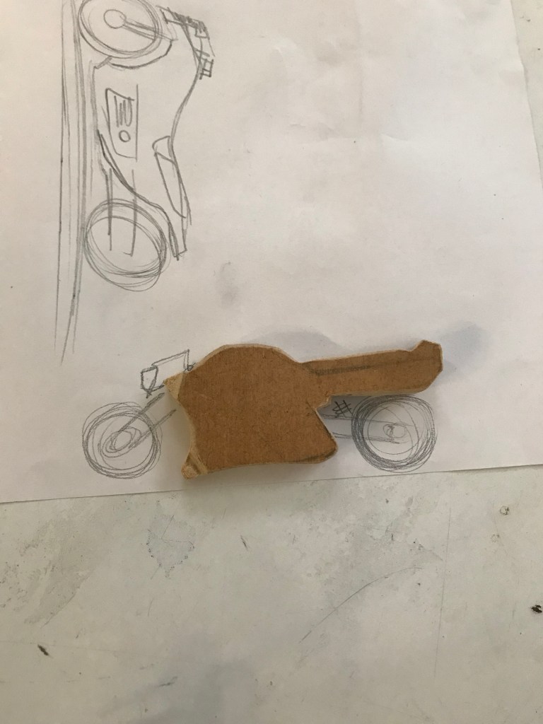 After looking at my sketches I wanted to experiment with a material and try creating the body of a motorcycle. The type of wood I used was MDF. I started by drawing the shape of the body and using the band saw to cut larger pieces of wood into a smaller section. Next, I used a chisel and hammer to carve out the shape of the motorcycle. By the end of the day I had a complete motorcycle body.