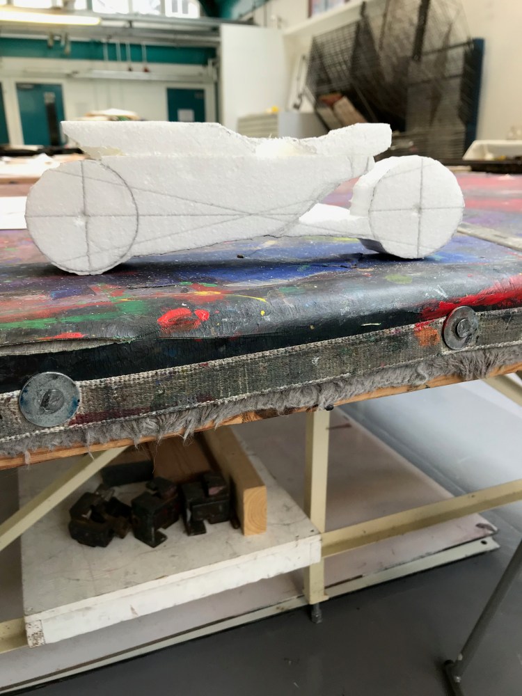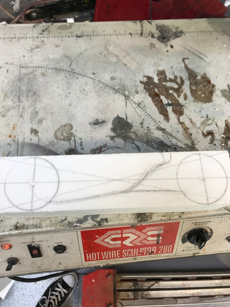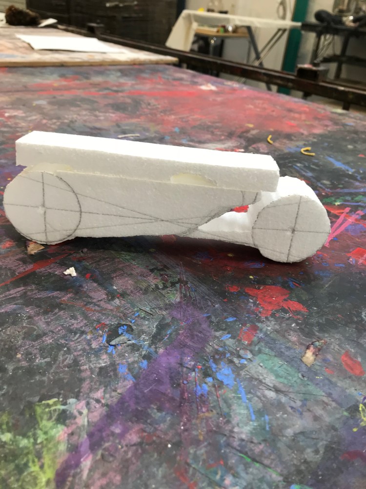 In this week I also began the experimental phase of the project. I started by creating a motorcycle from Styrofoam. The reason I wanted to use this material is because it can easily be cut and shaped using a hot wire. To begin with I drew out the wheels of the motorcycle and continued drawing the rest of the basic motorcycle body shape. I then went to the hot wire and switched it on. After it heated up slowly cut around the lines I had made. I realised I cut too much material off, so I used scraps of Styrofoam and glued it to the motorcycle with hot glue. And shaped it with the hot wire. After this was done, I felt that the model was missing curved and body lines.