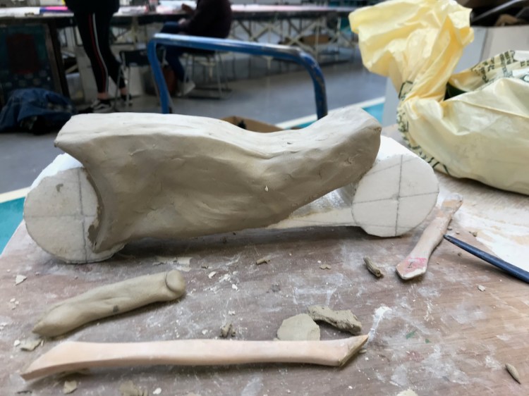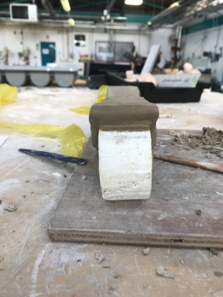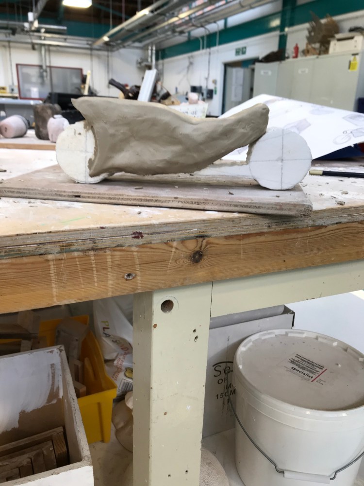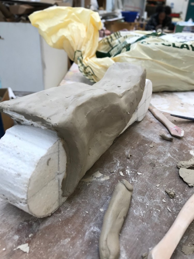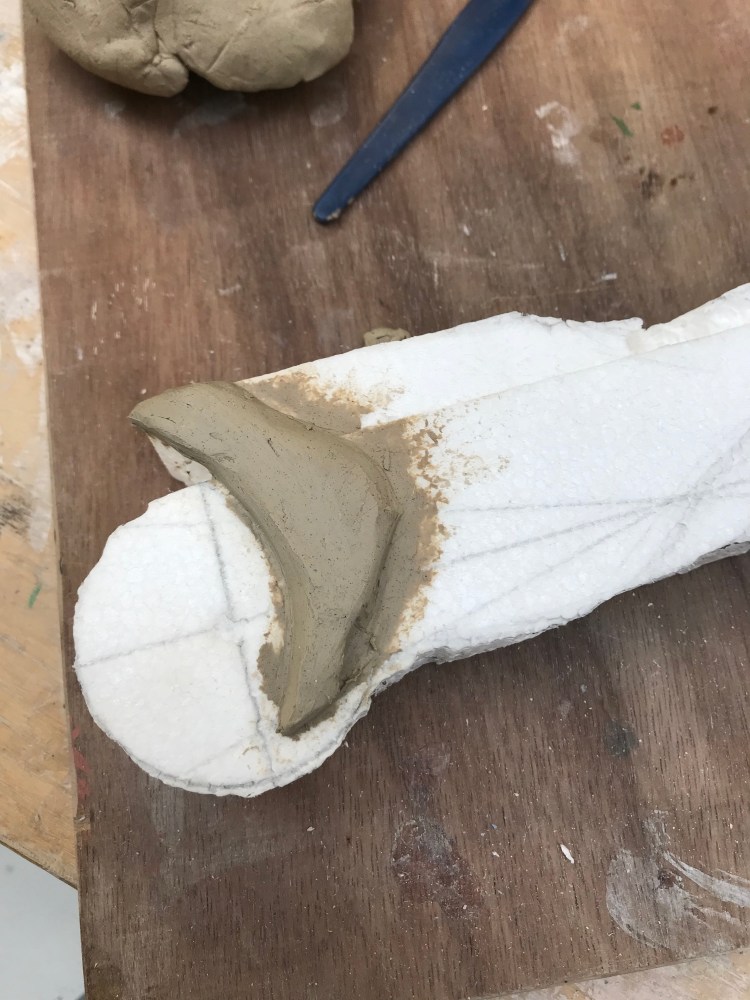 This gave me the opportunity to experiment with clay. I pushed clay on to the Styrofoam and it surprisingly stuck to the material well. I then continued to add clay to the motorcycle while using my thumbs and fingers to shape the clay with some basic curves. This would make it easier for me to go back with clay tools to carve out shapes as there would be less clay to take out. I then coved the model with a plastic back and let it dry out for a few days.