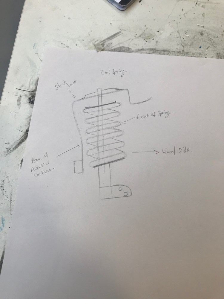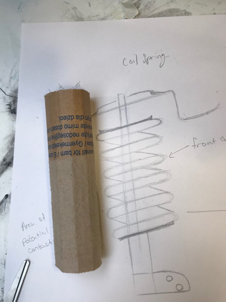 Using the pictures that I collected from my primary research, I decided to draw a piece of the suspension (shock absorber and spring) and a spark plug. From these two drawings I decided that I will create the suspension part because it looked to be the simplest and easiest to replicate because the spark plug is made of smaller parts and it’d be difficult to replicate this for a first attempt. When I came to collect materials, I decided to make this model out of cardboard because I had seen on video on YouTube of an artist creating a F1 car made of cardboard and could see that this material is very versatile.