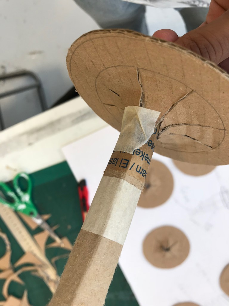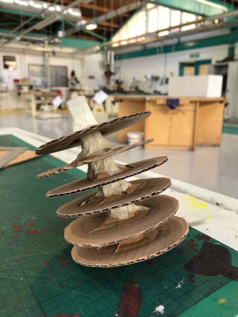 To conclude cardboard is a very useful material as It is strong and flexible. This was demonstrated when I was able to get the circles to bend at an angle so that it’d look like a spring. As well as this the material itself is readily available and is easy to come by. The model was made from gathering material from a cardboard bin in the workshop. The model was somewhat successful because I was able to create exactly what I had designed. However, I had made some errors when measuring some elements which left a gap. A draw back from using this material from what I saw from my outcomes was that It left the edged exposed. This left an untidy finish. This might be fixed by flattened strip of card or paper to hide them.