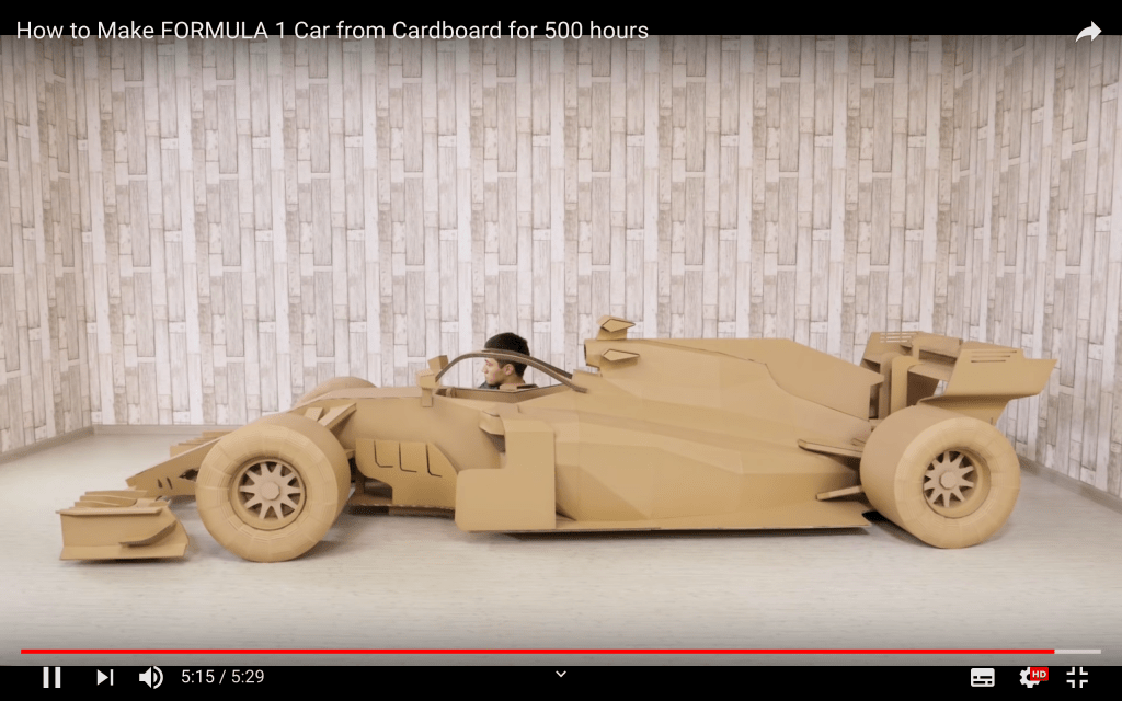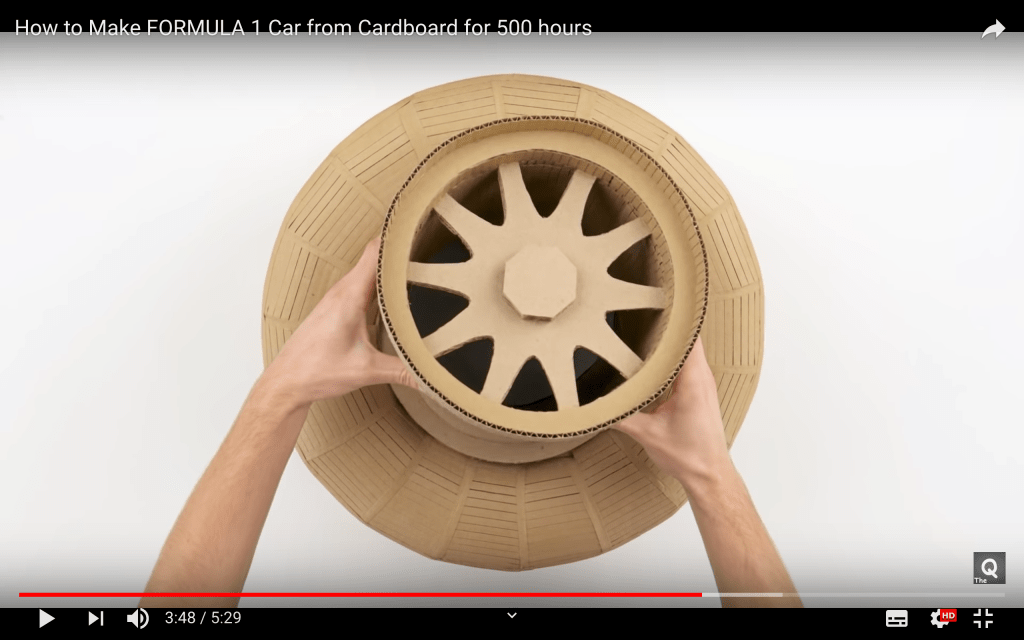 The Q is a YouTube channel that makes videos based on science as well as arts and craft. A popular video featured on this channel is of an artist creating a 1.3:1 scale model of a formula 1 car constructed of only cardboard held together with glue.